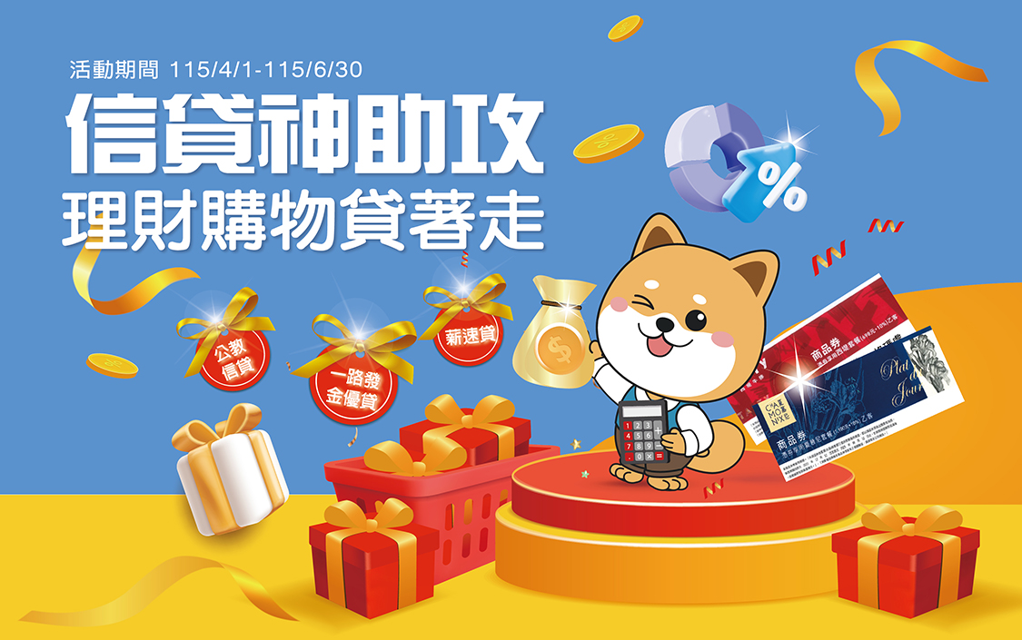 計算範例:貸款金額:30萬元整,貸款期間:5年,貸款利率:以一段式機動利率方案2.56%為例,各項相關費用總金額:新台幣5,300元,總費用年百分率:3.28%。本總費用年百分率之計算基準日為114年7月15日,年百分率計算基準日及日後年百分率會依實際借款期間、利率調整等因素而變動。總費用年百分率不等於貸款利率。